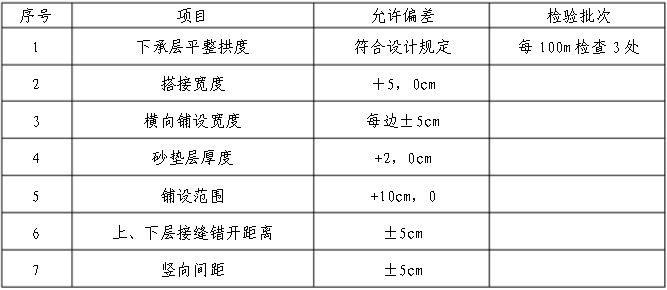 6、鋪設(shè)的土工膜及上下中、粗砂底面高程誤差、縱橫向坡度平整度滿足設(shè)計(jì)要求。施工質(zhì)量要求應(yīng)滿足下表: